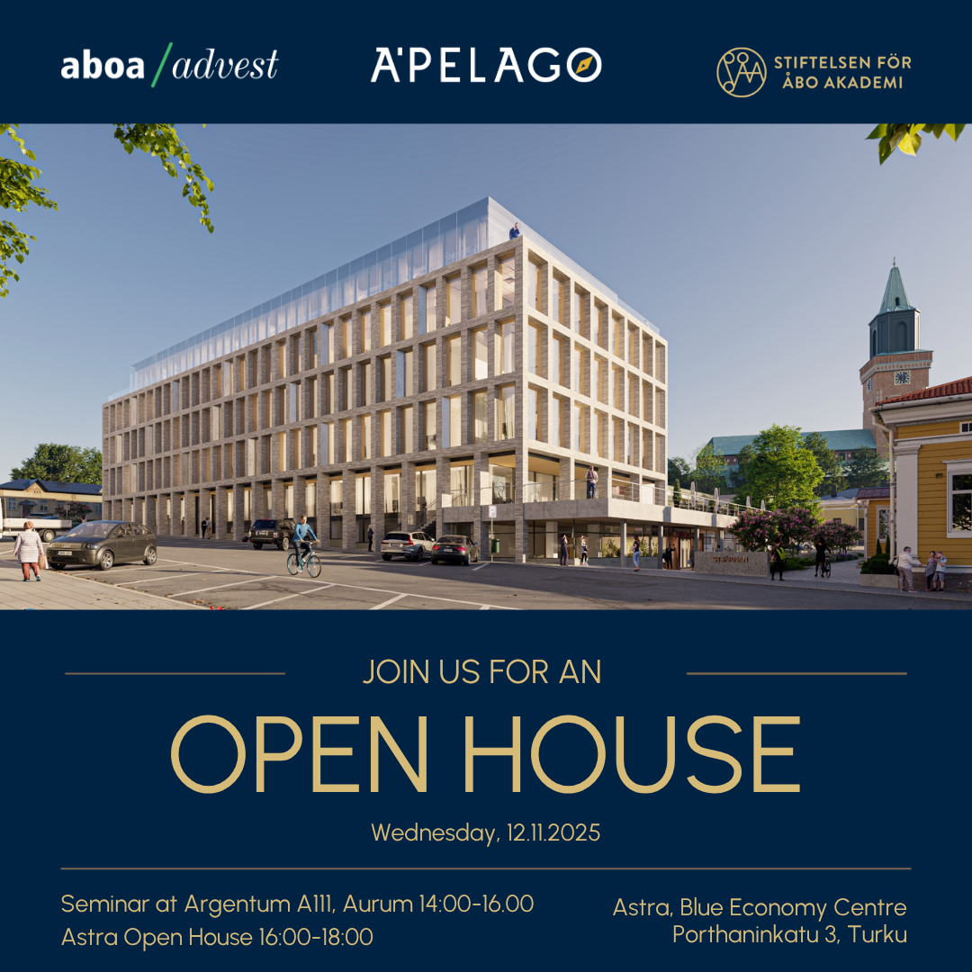 The Astra campus building, built by the Åbo Akademi University Foundation in Turku, houses the new Blue Economy Centre, which focuses on advancing the development of the blue economy. The Turku-based investment company Aboa Advest has brought together various actors from the blue economy sector within the centre's premises.