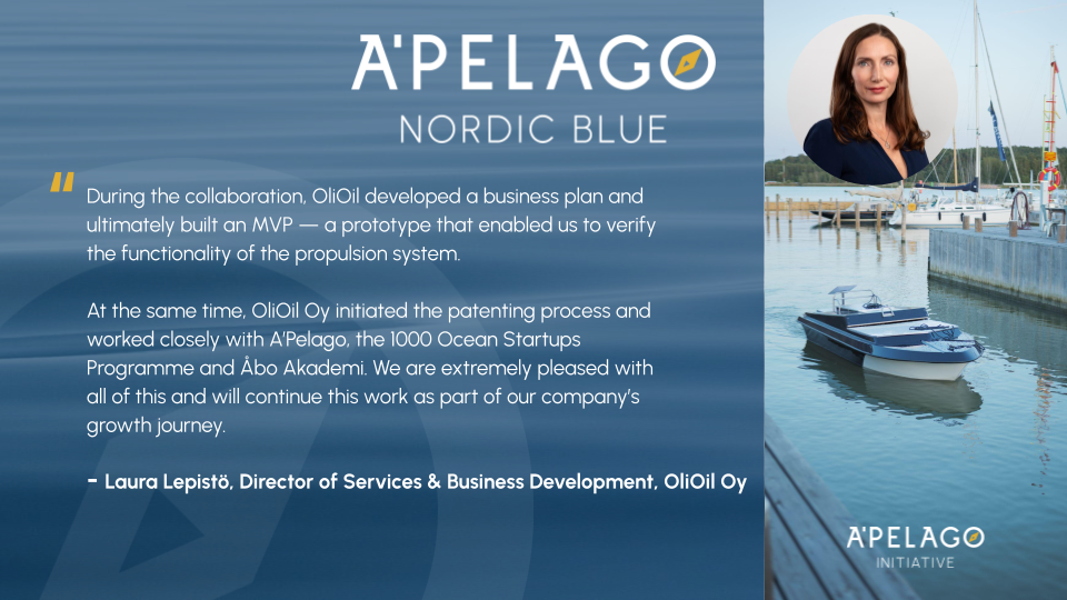 “Under samarbetet utvecklade OliOil en affärsplan och byggde slutligen en MVP — en prototyp som gjorde det möjligt för oss att verifiera funktionaliteten hos framdrivningssystemet. Samtidigt initierade OliOil Oy patentprocessen och arbetade nära med A’Pelago, 1000 Ocean Startups Programme och Åbo Akademi. Vi är mycket nöjda med allt detta och kommer att fortsätta arbetet som en del av företagets tillväxtresa.”